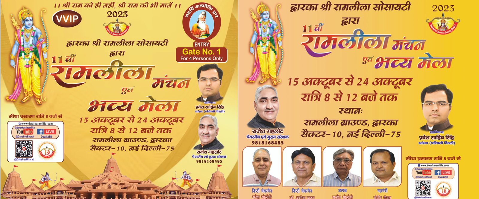 Dwarka Sri Ramlila Society is organizing 11th Ramlila in Sub City Dwarka at Sector-10, Dwarka Near Muthoot Hospital Ground. It’s a days long event starting from, 26th September,2023 till 5th October 2023. Ramlila (literally 'Rama’s lila or play') is a dramatic folk re-enactment of the life of Lord Ram, ending up in ten-day battle betweenLord Ram and Ravan, as described in the Hindu religious epic, theRamayana. A tradition that originates from the Indian subcontinent, the play is staged annually often over ten or more successive nights, during the auspicious period of 'Sharad Navratras',